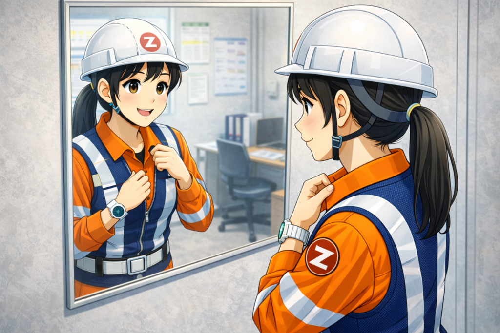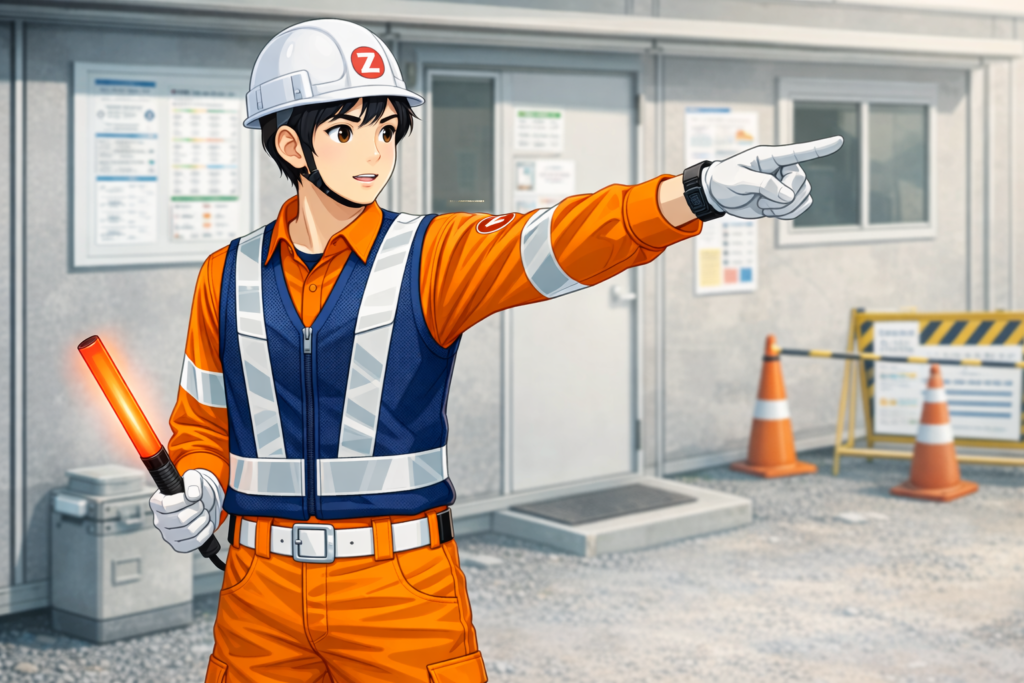 | ■ 勤務中 合図は落ち着いて、分かりやすく出せているか 自分の立ち位置が安全か、意識できているか 車両、歩行者、作業員の動きを広く見られているか 迷ったときに一人で抱え込まず報告・連絡できているか |